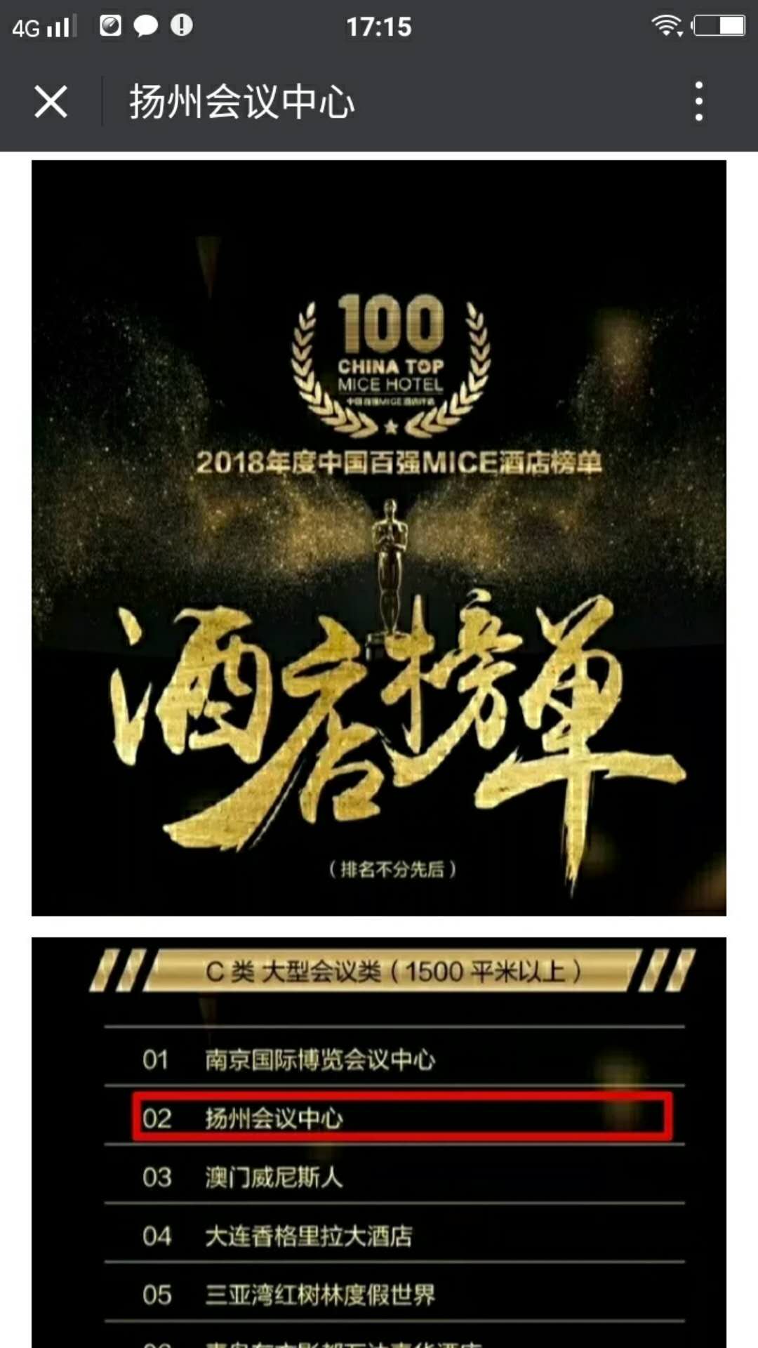 揚州會議中心榮獲“2018年中國百強MICE酒店”大獎 為揚州唯一一家