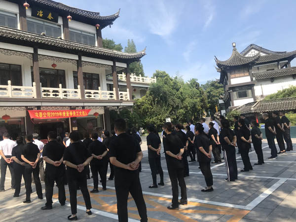 參與此次“夏季大練兵”的人員,從總經(jīng)理到計(jì)時(shí)工,從50后一直到90后,全體員工一視同仁,分五批次在冶春御馬頭店進(jìn)行輪訓(xùn)。內(nèi)容涵蓋軍訓(xùn)和服務(wù)技能培訓(xùn),軍訓(xùn)主要包括稍息、立正、轉(zhuǎn)體等隊(duì)列訓(xùn)練,服務(wù)技能培訓(xùn)主要包括服務(wù)站姿和托盤等技能訓(xùn)練。