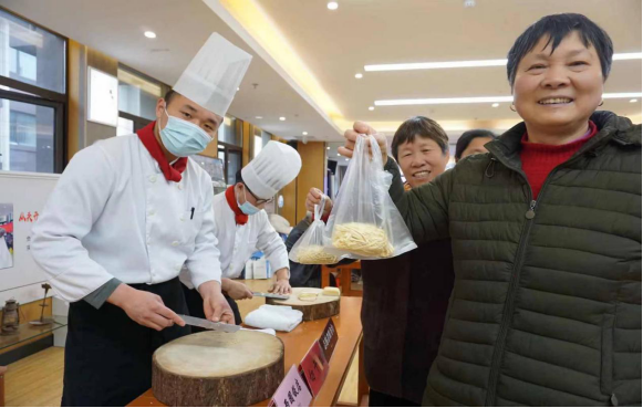 飯店年輕的大廚們一早就搭起了志愿臺(tái),為轄區(qū)居民展示了絕活劈干絲,居民們一邊排著長(zhǎng)隊(duì),一邊贊不絕口的發(fā)出感慨:“這刀工真是好??!”還有的居民們提著大廚們劈好的干絲,饒有興趣的和他們探討起如何才能做出口味鮮美的揚(yáng)州特色菜“雞火煮干絲”的制作工藝。