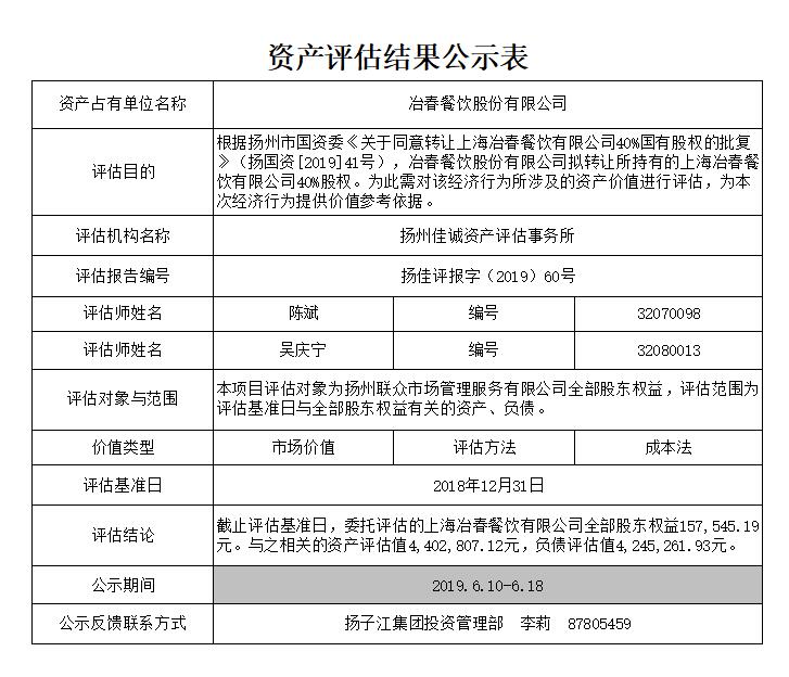 根據(jù)揚(yáng)州市國資委《關(guān)于同意轉(zhuǎn)讓上海冶春餐飲有限公司40%國有股權(quán)的批復(fù)》(揚(yáng)國資[2019]41號(hào)),冶春餐飲股份有限公司擬轉(zhuǎn)讓所持有的上海冶春餐飲有限公司40%股權(quán),現(xiàn)公告如下: 一、經(jīng)過甄選比價(jià),冶春餐飲股份有限公司選聘揚(yáng)州佳誠資產(chǎn)評(píng)估事務(wù)所承擔(dān)本次股權(quán)轉(zhuǎn)讓的評(píng)估工作,評(píng)估基準(zhǔn)日為2018年12月31日(相關(guān)評(píng)估內(nèi)容見《資產(chǎn)評(píng)估結(jié)果公示表》)。 二、自公告之日起7個(gè)工作日內(nèi)接受咨詢,咨詢電話:87805459,聯(lián)系人:李莉。
