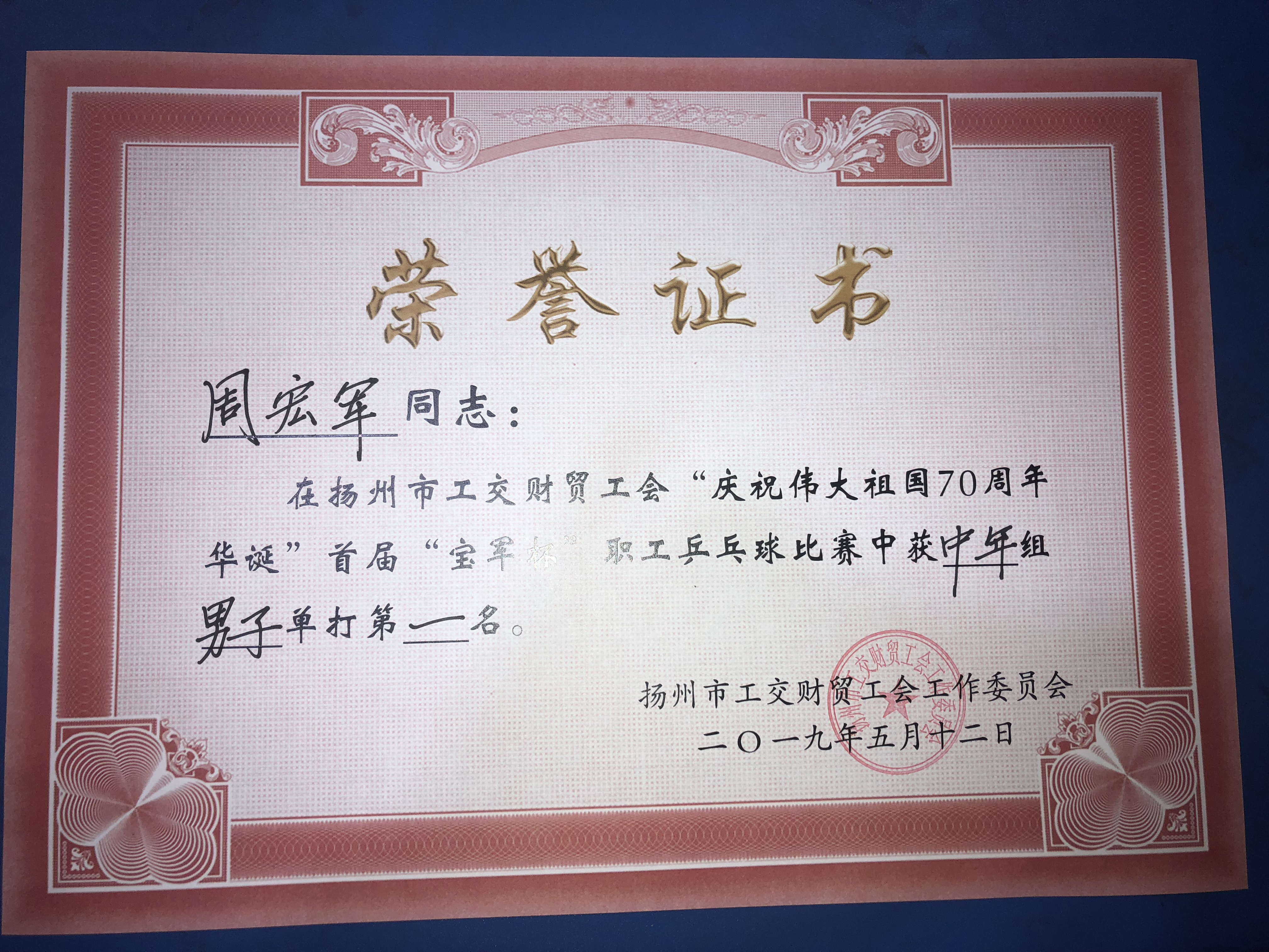 為慶祝新中國成立70周年,豐富職工的文體生活,5月12日,揚子江集團選拔優(yōu)秀選手組隊參加市公交財貿(mào)工會舉辦的“慶祝偉大祖國70周年華誕”首屆“寶軍杯”職工乒乓球比賽。 此次比賽采用單循環(huán)、11分制賽制,分設(shè)青年組男子單打、青年組女子單打、中年組男子單打和中年組女子單打四個項目。經(jīng)過一天的激烈對抗,最終代表集團參賽的揚州商城周宏軍奪得中年組男子單打第一名,西園飯店邵堂獲得中年組男子單打第三名,珍園實業(yè)公司劉磊獲得青年組男子單打第三名。周宏軍也將代表市公交財貿(mào)工會參加市第十三屆運動會。(集團黨辦 沈揚) |