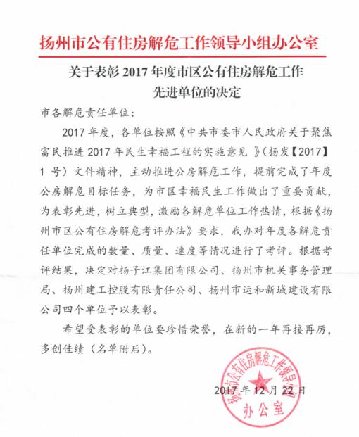 近日,市共有住房解危工作領(lǐng)導(dǎo)小組辦公室發(fā)來2017年度公房解危工作表彰單位名單,揚子江集團榮獲一等獎。 2017年市委、市政府1號文件要求集團完成1000㎡公房解危工作。在政府相關(guān)部門的支持和指導(dǎo)下,集團8月份已提前超額完成1475.6㎡解危任務(wù),45家住戶解決危房困難,其中包括異地安置解危5戶、面積178.20㎡,修繕公有住房40戶、面積1297.4㎡。下一階段,將加大對遺留問題的處理力度,同時繼續(xù)做好2018年的解危工作,力爭全面落實完成好市委、市政府交辦的工作任務(wù)。(集團辦公室)